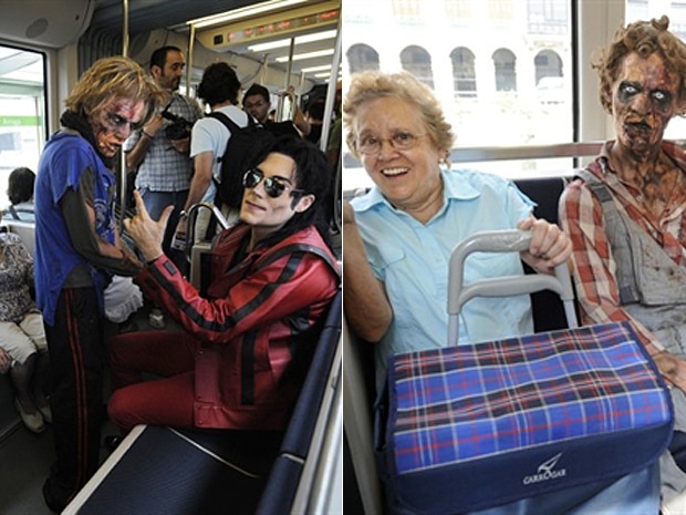 Ruas de Bilbao foram invadidas por mortos-vivos para lançar espectáculo. Atores fantasiados andaram de ônibus ao lado de um sósia do Rei do Pop.(+)