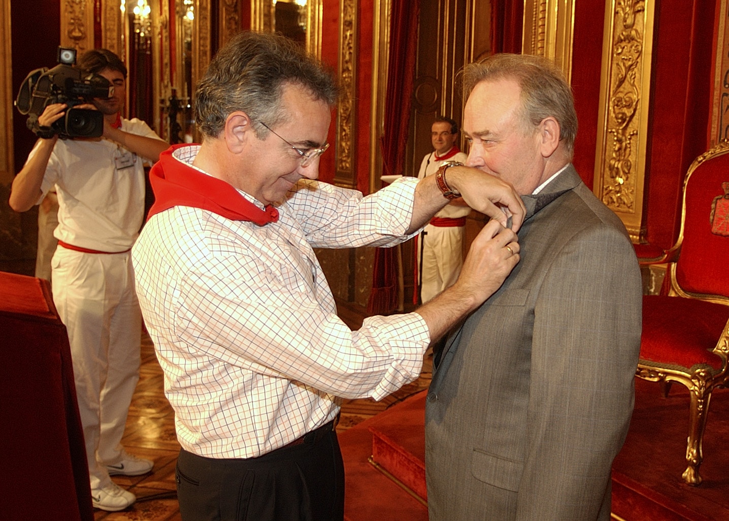 l presidente de Navarra impone la insignia de Navarra a Agustín Otondo en una visita realizada por socios del Centro a la comunidad foral en 2003.