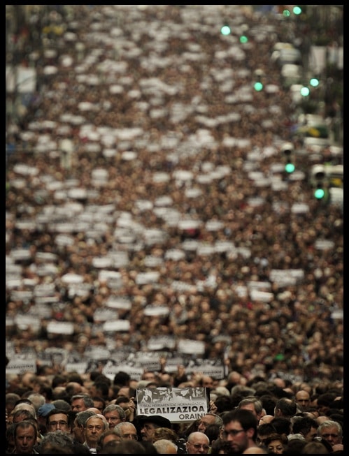 La demostración de apoyo ha sido similar a la que ya realizaron cuando se iban a iniciar las deliberaciones en el Supremo, una gran mnifestación en Bilbao. Y si la anterior fue grande, esta, la de hoy a la tarde, también lo ha sido. No sabriamos decir si mayor o menor. No nos sentimos capaces de calcularlo. Lo que sí podemos asegurar es que ha sido es multitudinaria.