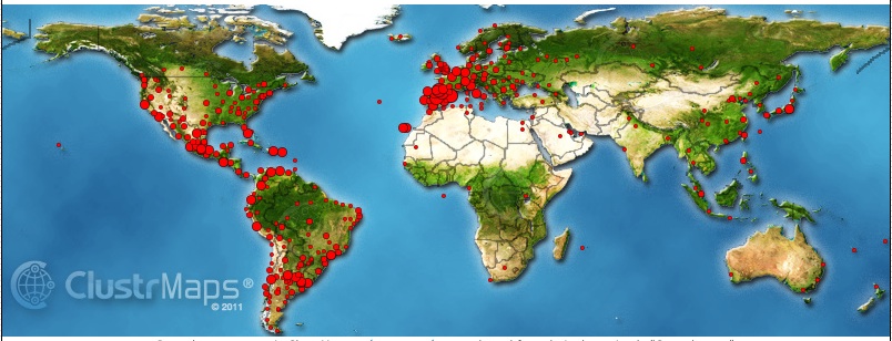 Poco despues, el 11 de octubre, nos suscribimos al servicio ClustrMaps, que ofrece una información visual muy clara de cuál es la distribución de nuestros lectores a nivel mundial. Les dejamos una imagen de cómo se distribuyen nuestros visitantes desde ese momento. Y si quieren ver todos los datos, incuido por continentes, no dejen de visitar este link.