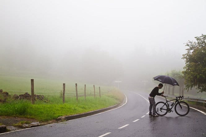 My hands are numb when we reach Gernika. We’ve descended for miles, shooting down from the lush greenery of the mountains on narrow roads that cut through vineyards and farmland. As we wait for our support vans to give us instructions, I am not too cold to appreciate the fact that I am standing in the middle of a town that inspired Picasso’s monumental anti-war painting when it was bombed during the Spanish Civil War. To my left, the town spills down a hillside into a bowl, little colored rooftops dotting the landscape. If I squint through the rain, I can almost envision the painting.