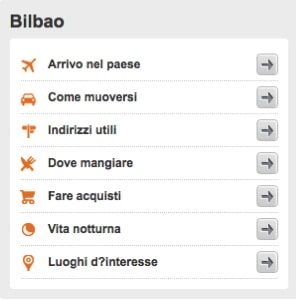 la página en italiano de Destinia.com ofrece a sus lectores interesado en Bilbao una muy práctica recopilacion de datos útiles y esenciales para visitar esta ciudad vasca. Esta guia de viaje esta dividdida en siete secciones:
