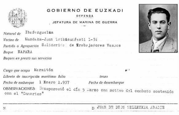 Juan de Dios era marino mercante, nacido en Akorda (Ibarrangelu). Falleció el pasado lunes en el Hospital de San Agustín (Avilés). El funeral por el último superviviente del épico bou Nabarrase celebró ayer en San Juan de la Arena -donde residía- y, acto seguido, fue trasladado a Avilés para ser incinerado. En 1936 vivía en Mundaka y el comienzo de la guerra le sorprendió en Inglaterra embarcado en un mercante. De STV, se alistó más tarde en la Marina Auxiliar del Gobierno de Euzkadi y le destinaron al bou Nabarra, donde embarcó en enero del 37 con 20 años como marmitón. Tomó parte en todas las actividades del bou (servicios de escolta y vigilancia) hasta el combate de Matxitxako con el crucero franquista Canarias, aquel inolvidable 5 de marzo de 1937.