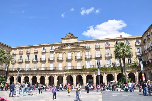 A Plaza Nueva no Casco Viejo é como as típicas Plazas Mayor que se vê por Espanha, ao centro tem a sede da Euskaltzaindia (Real Academia do Idioma Basco) e as arcadas abrigam lojas, bares e restaurantes.