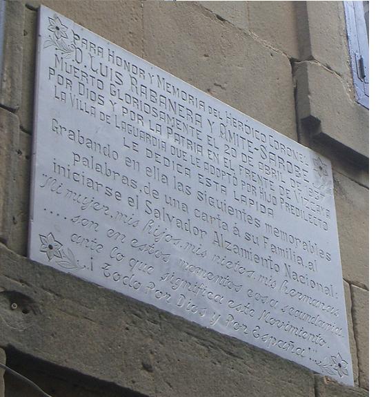 Podría empezar por esta placa que se puede encontrar hoy en Laguardia en memoria de Luis Rabanera, un militar golpista, que fue el tio-abuelo de Ramón Rabanera, reseñado miembro del PP del Pais Vasco y Ex Diputado General de Araba. Que, por cierto, se negó a colocar un un monolito en honor a los represaliados por el régimen de Franco, tal y como las Juntas Generales habían aprobado, mientras que la placa de su familiar aún está en la fachada de una casa de Araba.
