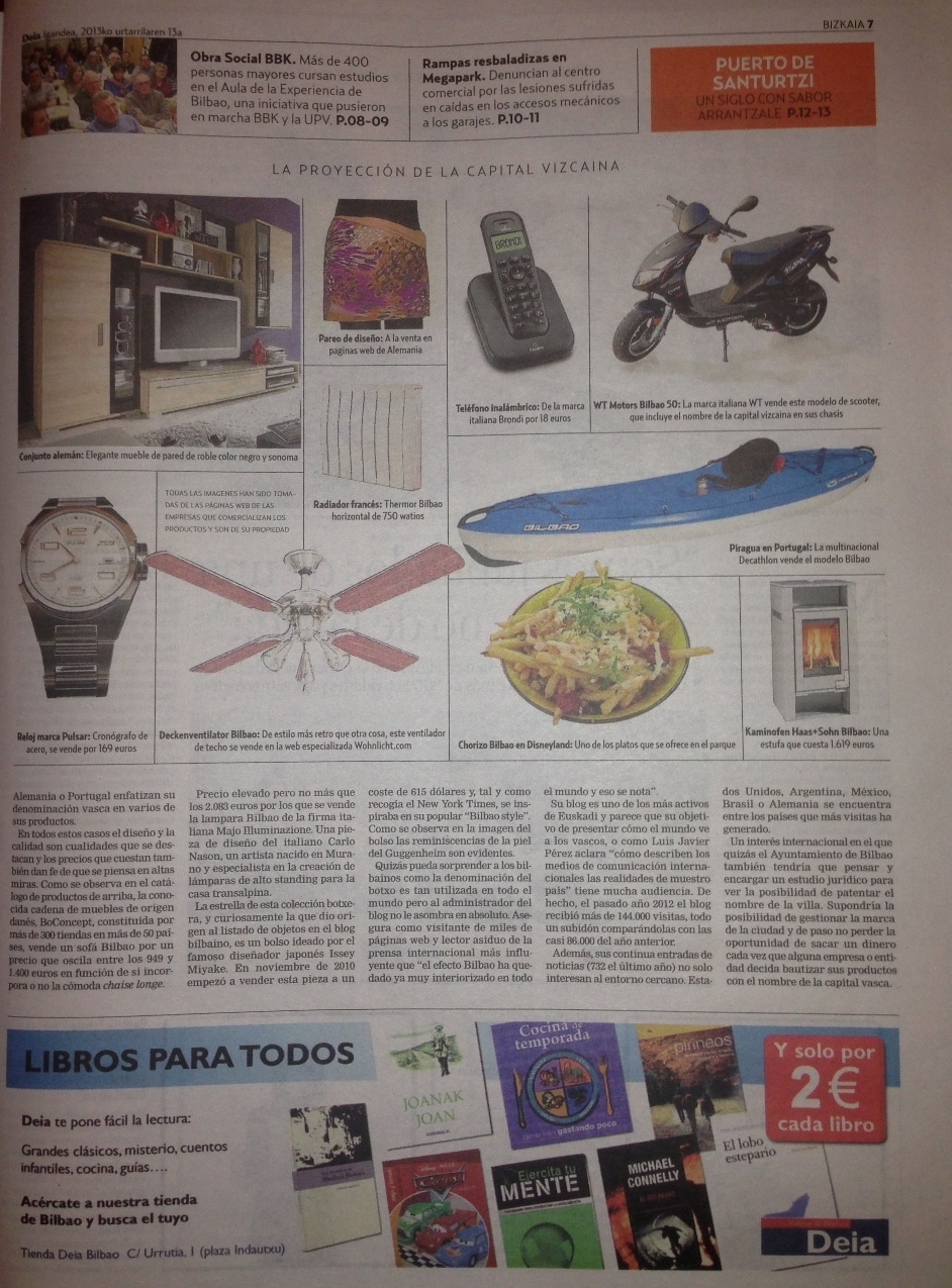 Hoy publica el diario vasco Deia un reportaje, firmado por Alberto García Alonso, sobre los objetos que en estos últimos años han sido bautizados con el nombre de Bilbao a lo largo de todo el mundo. Para ello, se basan en el trabajo que desde esta web, About Basque Country, hemos realizado a lo largo de los dos últimos años localizándolos y catalogándolos.