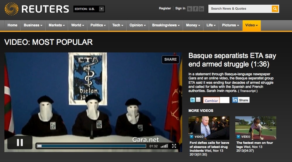 No deja de llamarnos la atención que uno de los vídeos incluidos en la selección «Most Popular» de la edición USA de la Agencia Reuters, sea el vídeo en que se informa del mensaje de ETA a través del que la organización terrorista informa del abandono definitivo de las armas.
