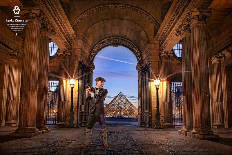 Nosotros lo nombramos hoy aquí porque nos hemos encontrado con una imagen que nos ha parecido digna de referenciar. Un James Bond del País,  capaz de combinar con una elegancia insuperable la pajarita con las albarcas;  o el gerriko con lo gemelos. Armado con una cámara de Super 8 este héroe vasco ha sido inmortalizado en París justo a las puertas de Le Louvre.