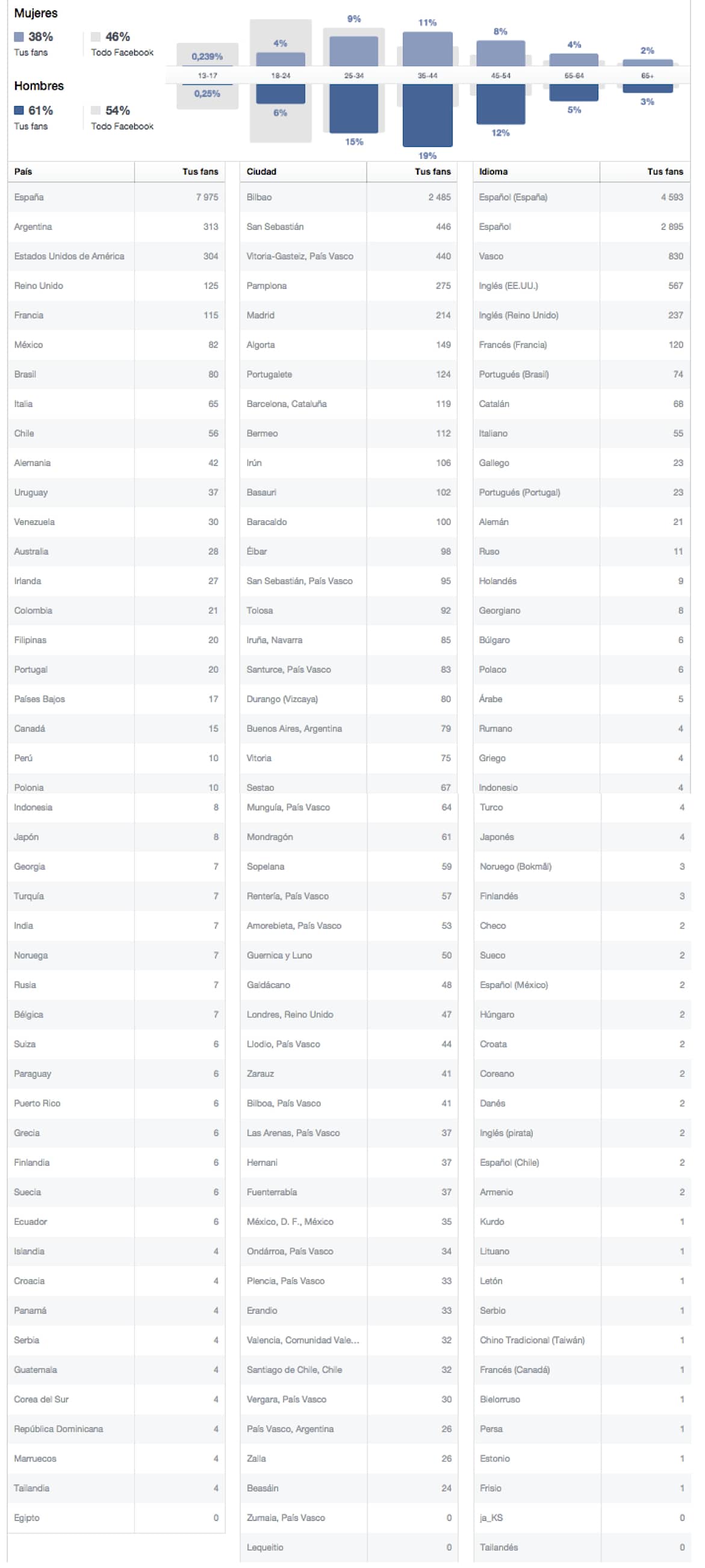 Podemos resaltar que tenemos muchos mas hombres que mujeres (menos mujeres que la proporción media de Facebook).¿La razón? no la sabemos, pero el dato ahí está.