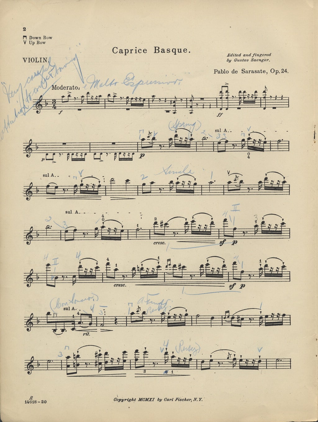 En esta ocasión traemos una partitura del «Capricho Vasco» del compositor y violinista navarro Pablo Sarasate publicada por la editorial neoyorquina Carl Fischer Music. El documento tiene un valor especial ya que está anotado por el violinista polaco-estadounidense Romano Totenberg.