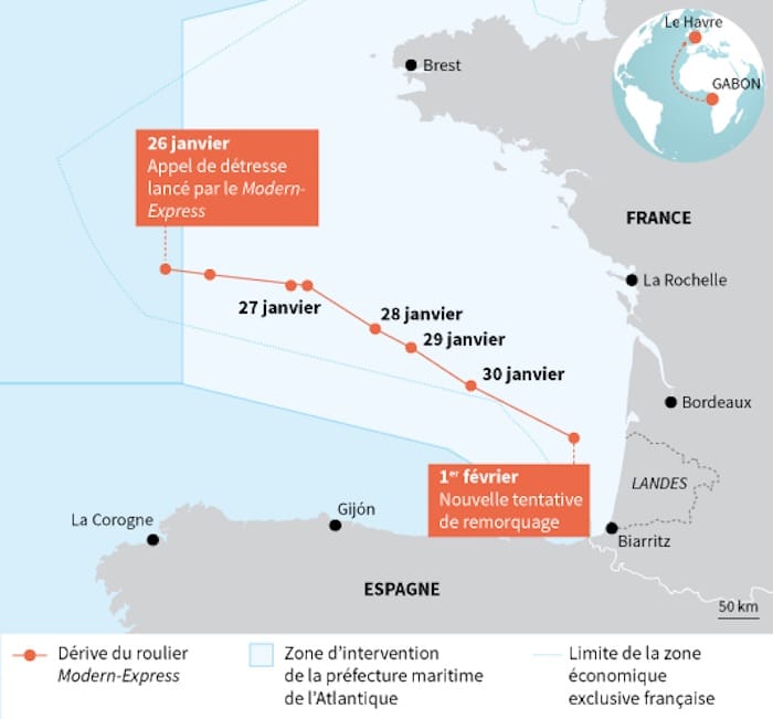 Le cargo à la dérive Modern-Express, dont l’opération de remorquage vers Bilbao, son port refuge, a débuté lundi, est « sorti de la zone exclusive économique française » mardi 2 février, selon la prefecture maritime Atlantique. Le convoi progresse actuellement à 3 nœuds (5,4 km/h) vers l’Espagne.