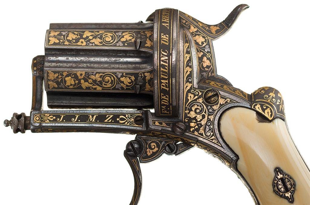 This double action pinfire revolver, manufactured by Paulino Aretio of Bilbao Spain, features an exquisite silver and gold inlaid foliate motif. The inlaid foliate covers nearly all of the metal surfaces on a matte black background. The vine and leaf pattern cover the cylinder flats, frame, recoil shields, loading gate, hammer, folding trigger, and grip straps. The sides for the frame have «J.J.M.Z.» inlaid in gold. The edge of the left recoil shield has «FaDE PAULINO DE ARETIO» inlaid on gold and the edge of the loading gate (right side) has «BILBAO» inlaid in gold.