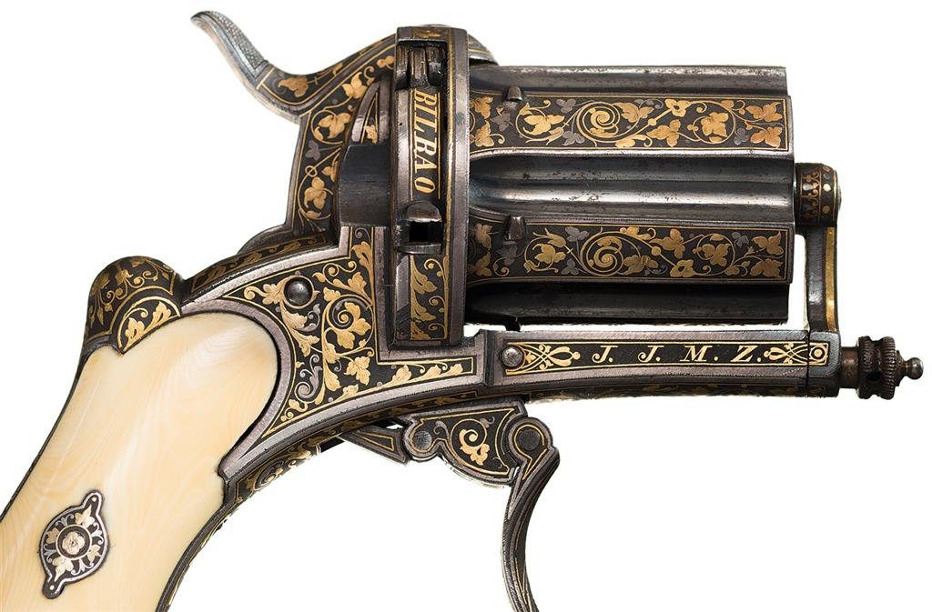 Más que un revolver, puede ser considerado una joya o una obra de arte. Este revolver pimentero, fabricado en Bilbao por Paulino de Aretio (seguramente a finales del XIX) está decorado con filigranas de oro y plata y tiene un acabado que le hace digno de un museo.