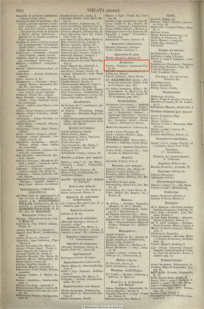 La aportación de un lector nos ha dado un poco de luz, en este asunto. Nos ha enviado un pdf del «Anuario del comercio, de la industria, de la magistratura y de la administración. 1886, no. 52» dedicado a Bizkaia. En su página dos, que aquí recogemos, se informa de la existencia de un armero con ese nombre cuyo comercio estaba en la Carnicería Vieja del Casco Viejo de Bilbao
