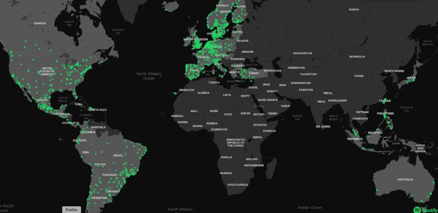 Les dejamos la información de Terra Chile, la información de presentación del servicio que publicó Spotify y el propio mapa. No sabemos si las ciudades «activas» (de las que se da información detallada) va cambiando. Cuando nosotros lo hemos comprobado, las ciudades vascas activas eran las de Bilbao e Iruña.
