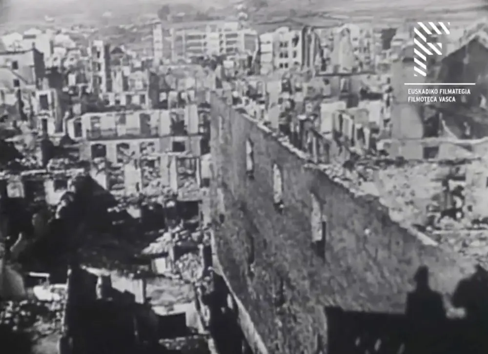 fotograma del documental Elai-alai donde se pueden ver los resultados del Bombardeo de Gernika (1938)