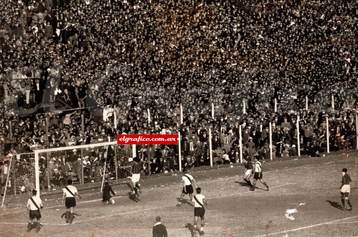El tercer gol de Lángara, o sea de San Lorenzo. Ballesteros puso en juego a Beristain, quien se internó en el área penal hasta colocar un centro corto y bajo, levemente hacia atrás, que hizo caer la pelota en los pies del centre forward; éste venció a Besuzzo con un shot a ras del suelo. (El Gráfico)