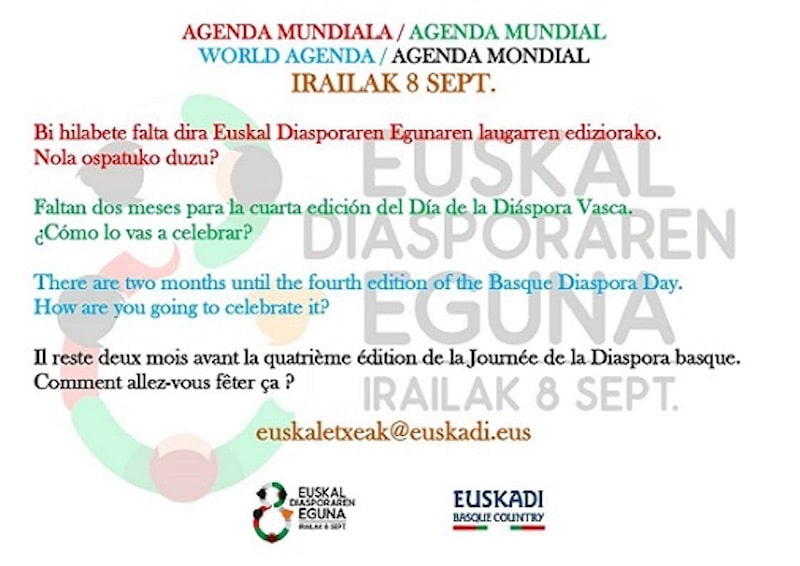 Nos acercamos a la cuarta edición de un día creado para recordar a las vascas y vascos que por las más diversas razones tuvieron que abandonar su patria y a sus descendientes, que han guardado en sus corazones el amor a su tierra de origen. También deber ser un día de reivindicación de nuestros compatriotas dispersos por el mundo y de confraternización. Esta es una conmemoración a la que le hemos prestado toda nuestra atención desde que se planteó la idea de instaurarla.
