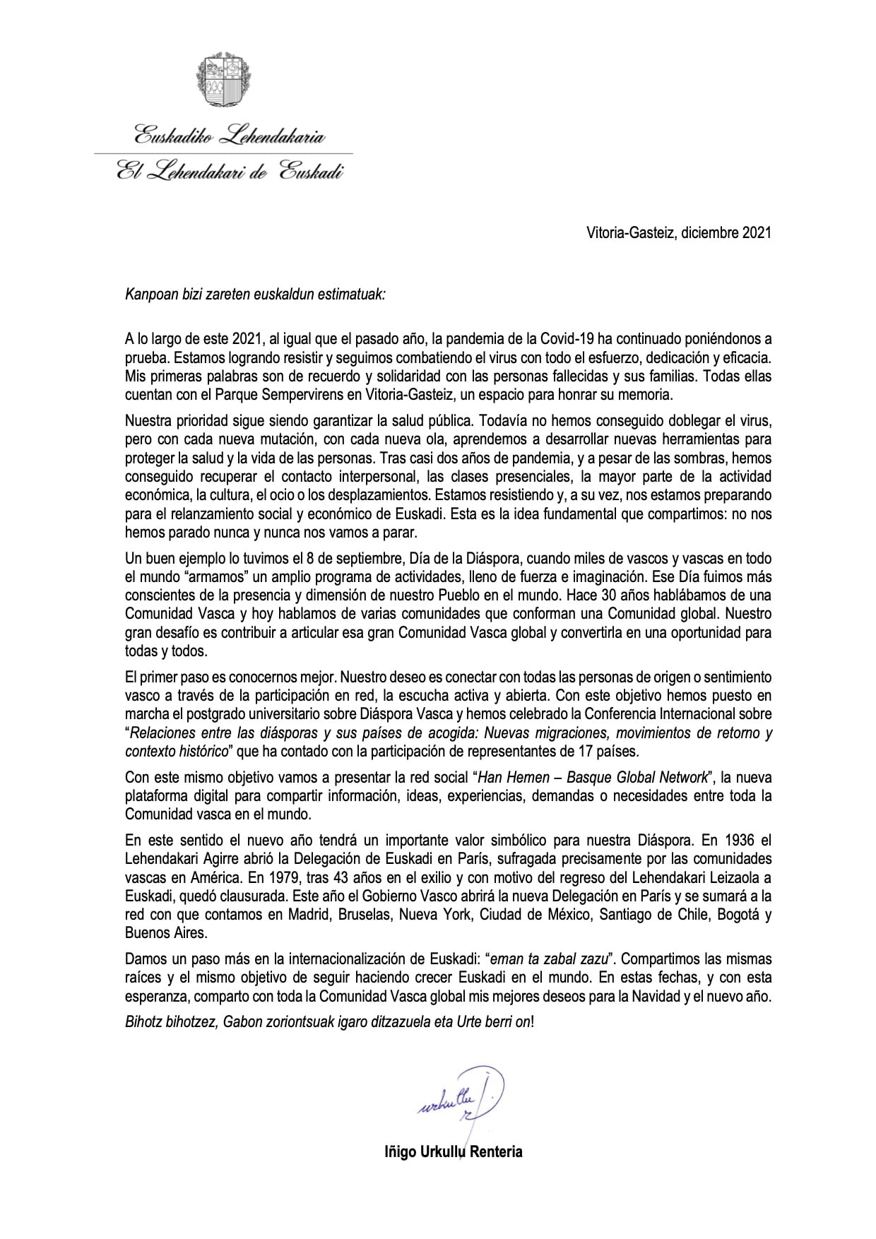 El Lehendakari Iñigo Urkullu ha enviado hoy su mensaje de Navidad dirigido a la Comunidad Vasca en el Exterior.