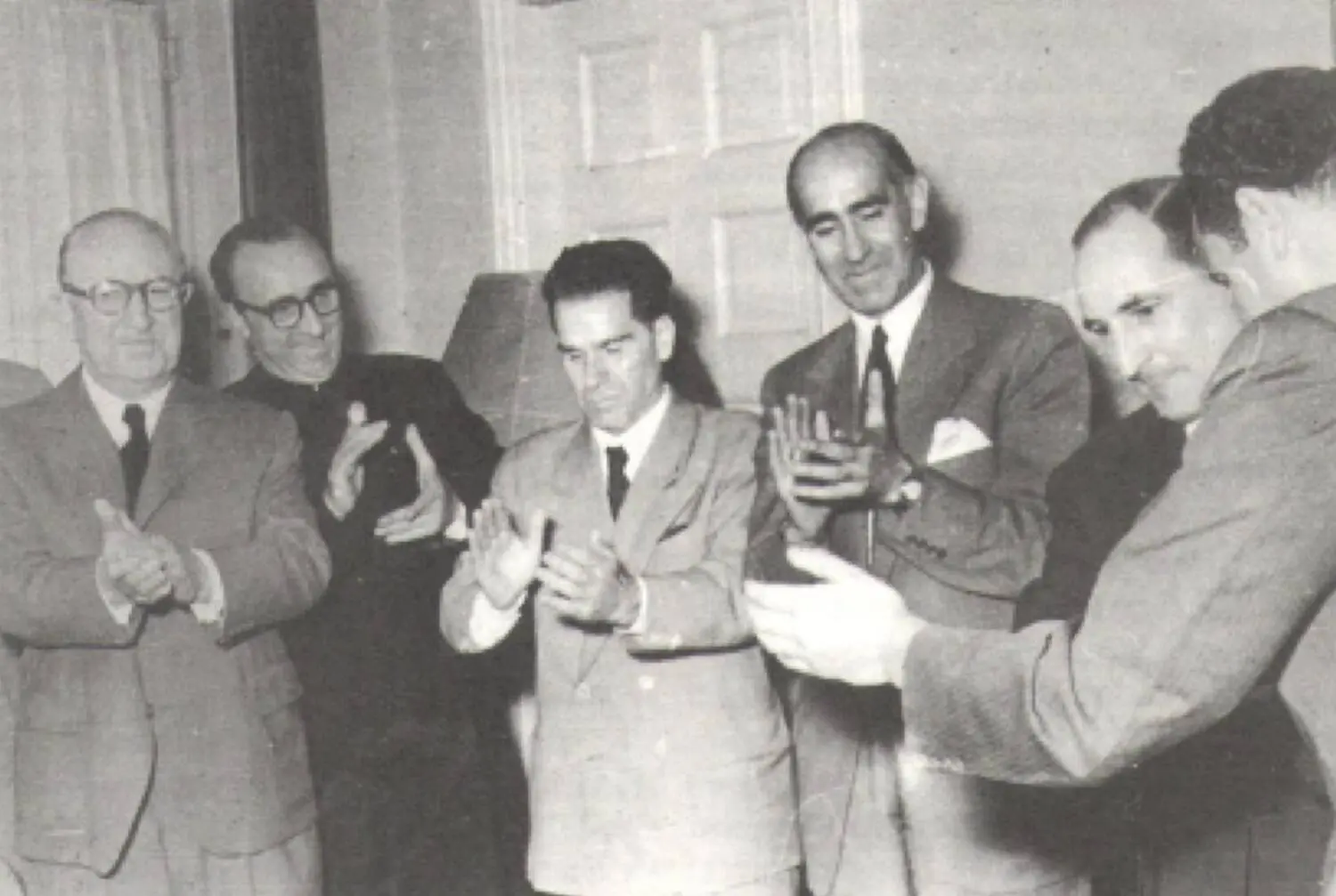 Conferencia de prensa (en el Plaza Hotel) (Final de la misma). De izd. a der.: Joaquín Gamboa, Iñaki Azpiazu, Andrés irujo, Basaldua y el Lehendakari Aguirre.
