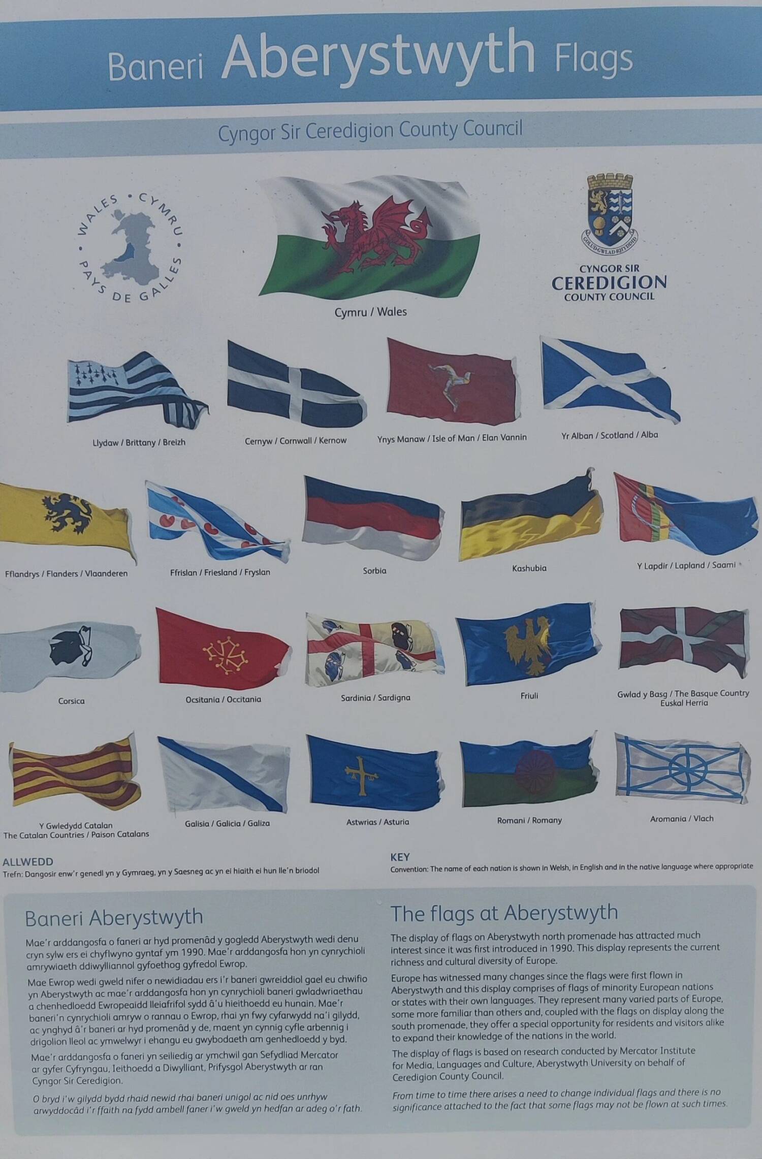 Europa ha sido testigo de muchos cambios desde que las banderas ondearon por primera vez en Aberystwyth y esta exhibición se compone de banderas de naciones o estados europeos minoritarios con sus propios idiomas. Representan muchas partes diferentes de Europa, algunas más familiares que otras y, junto con las banderas que se exhiben a lo largo del paseo marítimo sur, ofrecen una gran oportunidad para que los residentes y visitantes amplíen su conocimiento de las naciones del mundo.