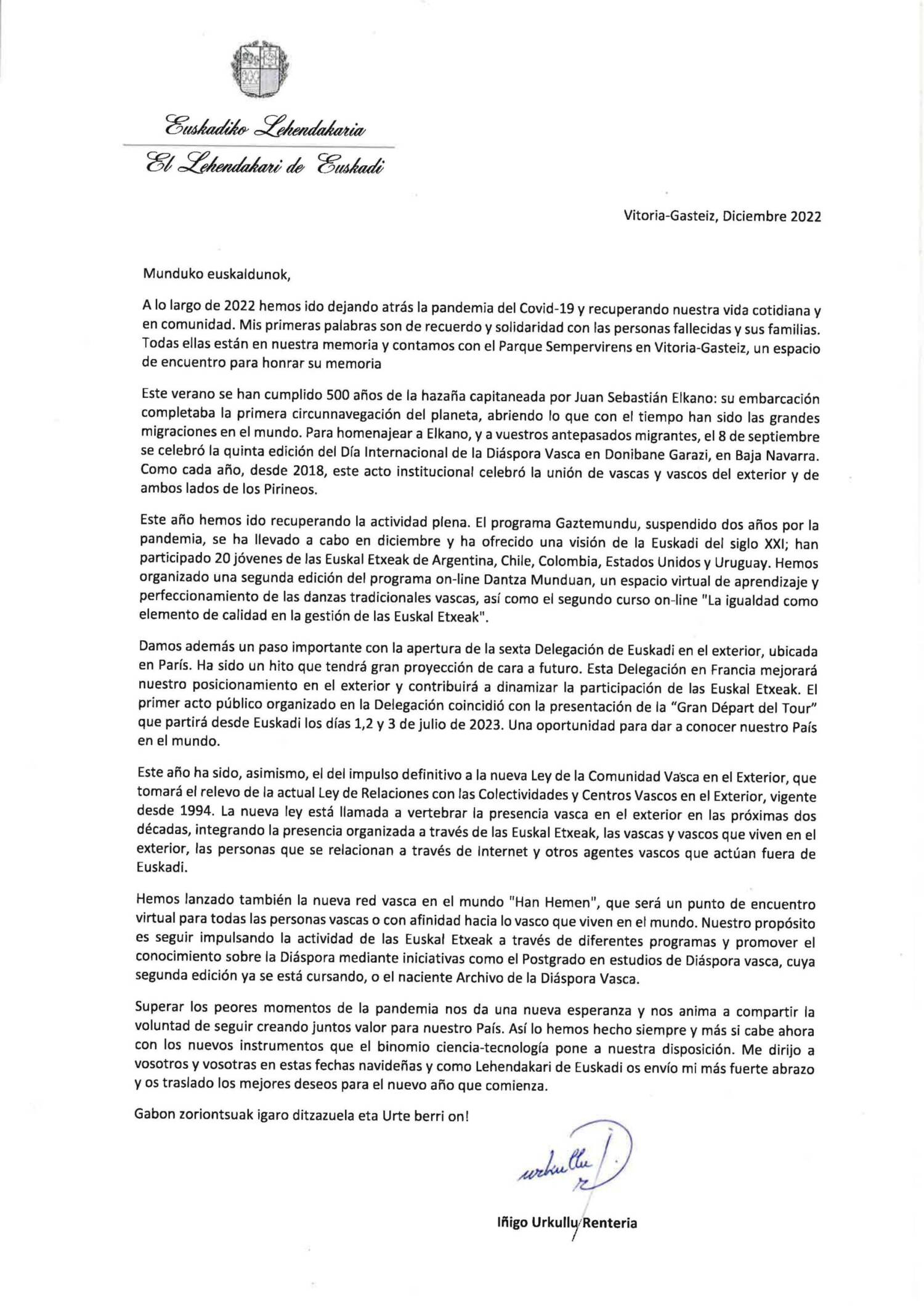 El Lehendakari finaliza su carta, enviando a los vascos del mundo un abrazo y sus mejores deseos para 2023.