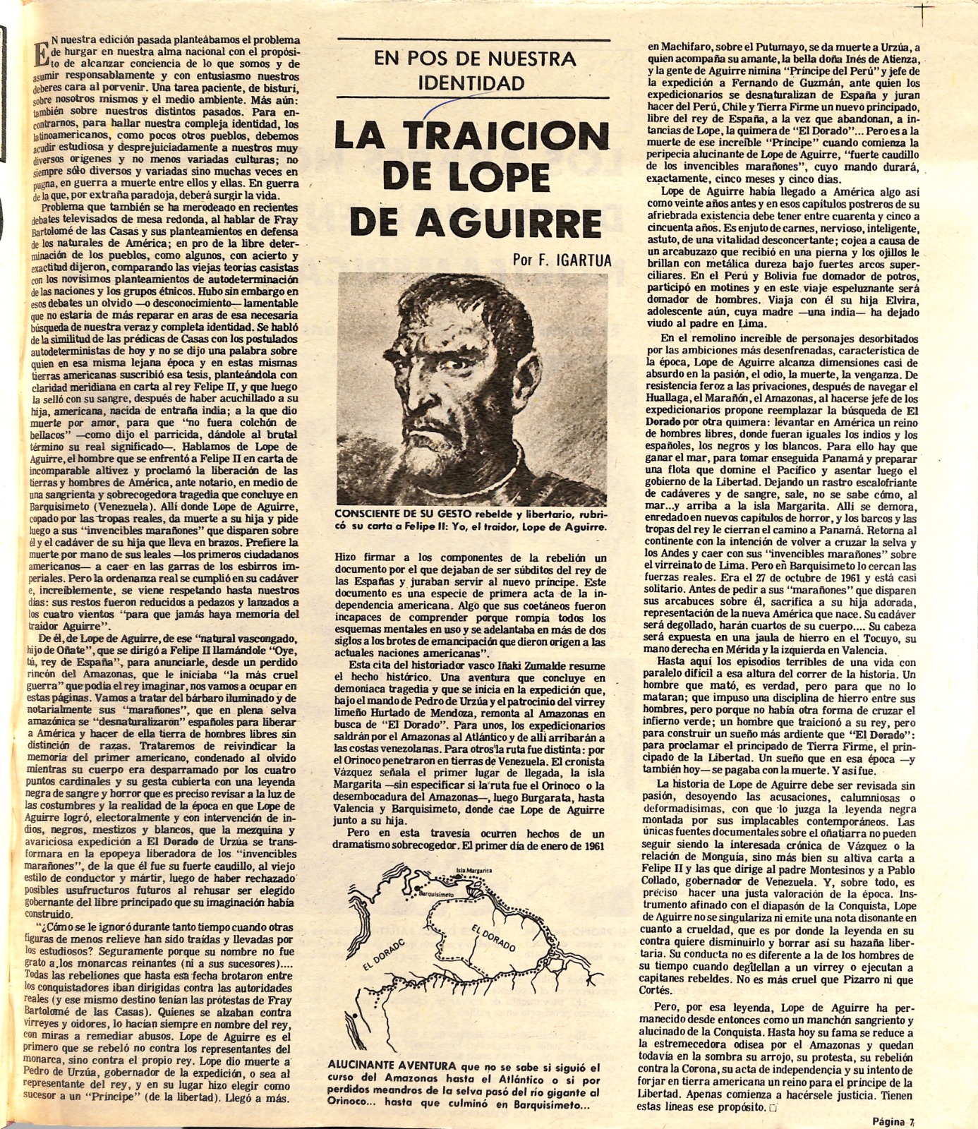 El segundo artículo, el de Lope de Aguirre «el loco», como se le suele llamar, o «el traidor» como él mismo se autodenomina en su extraordinaria carta a Felipe II donde declara la independencia de las tierras americanas en pleno siglo XVI, no sólo es una lección de análisis o de historia. Es la reivindicación de un hombre, de un vasco, olvidado y vilipendiado.