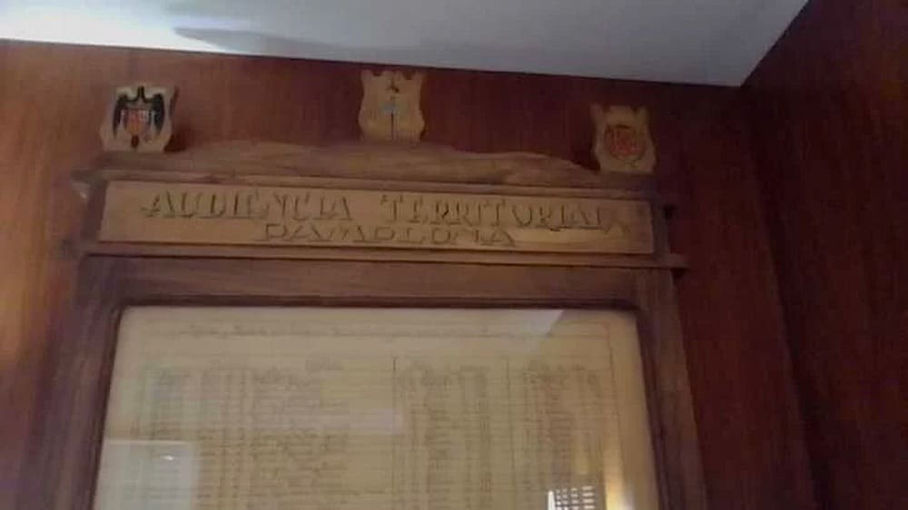 Algo que no parece que hayan sentido al convivir con los símbolos franquistas que se exhiben como en la sexta Palacio de Justicia, donde se encuentran los despachos de los magistrados titulares de los principales órganos: Presidencia, Secretaría de Gobierno, Sala de la Civil y Penal y Sala de lo Social tras su remodelación de 2010. Como se cuenta en el diario Naiz, «El Palacio de Justicia es un edificio moderno (se erigió en 1996) y el panel tuvo que trasladarse desde una ubicación anterior. La pieza tiene inscrito ‘Audiencia Territorial de Pamplona’, que es la denominación previa del Tribunal Superior de Justicia de Nafarroa».