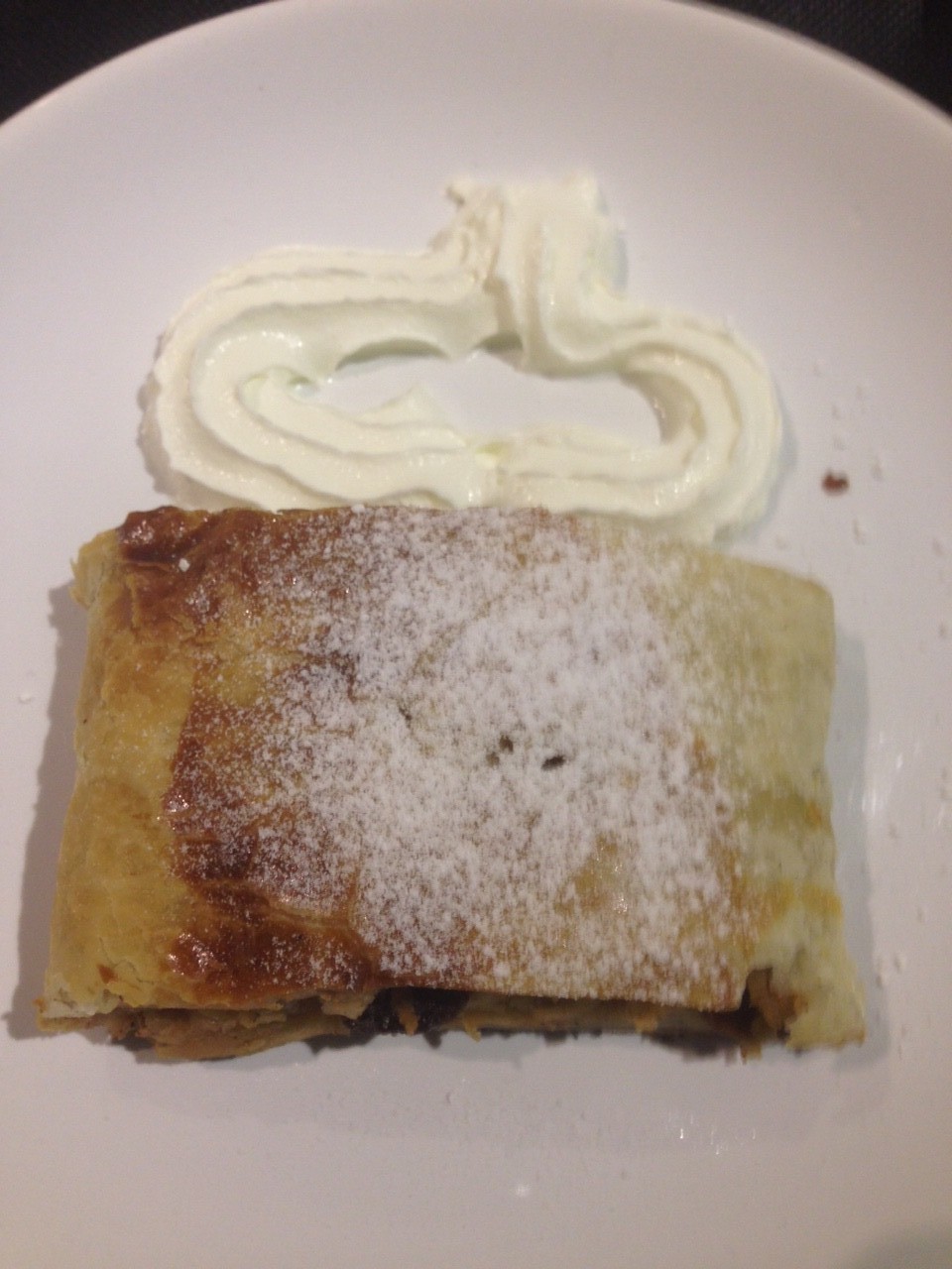 And the dessert was a real surprise: a scrumptious Jablecny Zavin. And what is a Jablecny Zavin? Well, it’s pastry filled with apple. With apple, raisins and other dried fruits. It can be served with cream, as it was in this case, or with some ice cream.