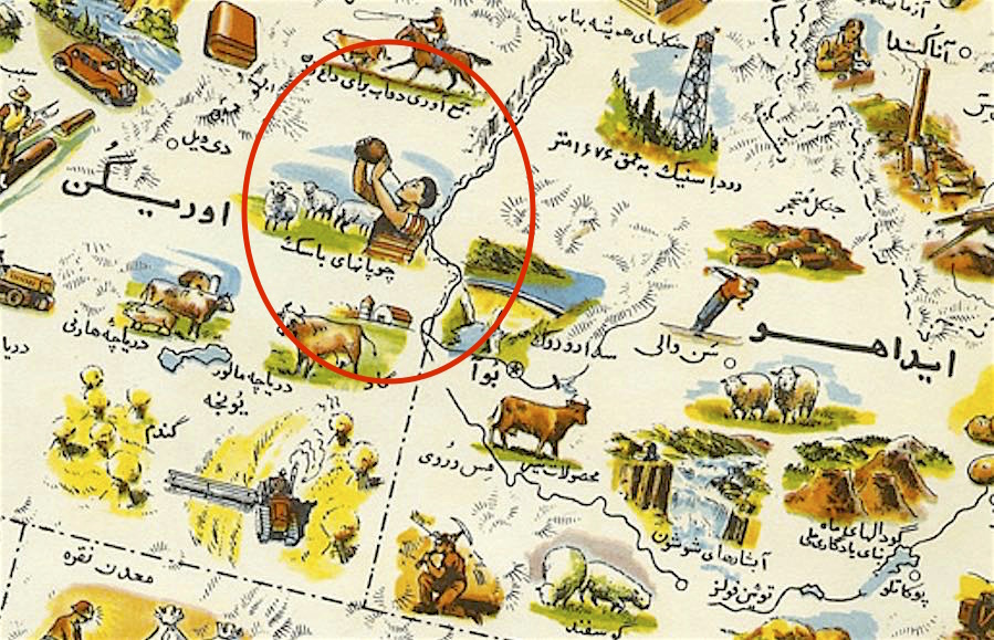 Among the photos collected in that digital album is a very special map of the US, symbolically showing 1950s America and quite uniquely written in Persian! In eastern Oregon, there is a drawing of a Basque shepherd, wearing a txapela, taking a good swig of wine while watching some sheep, who are in turn watching him and his unusual manner of quenching his thirst.