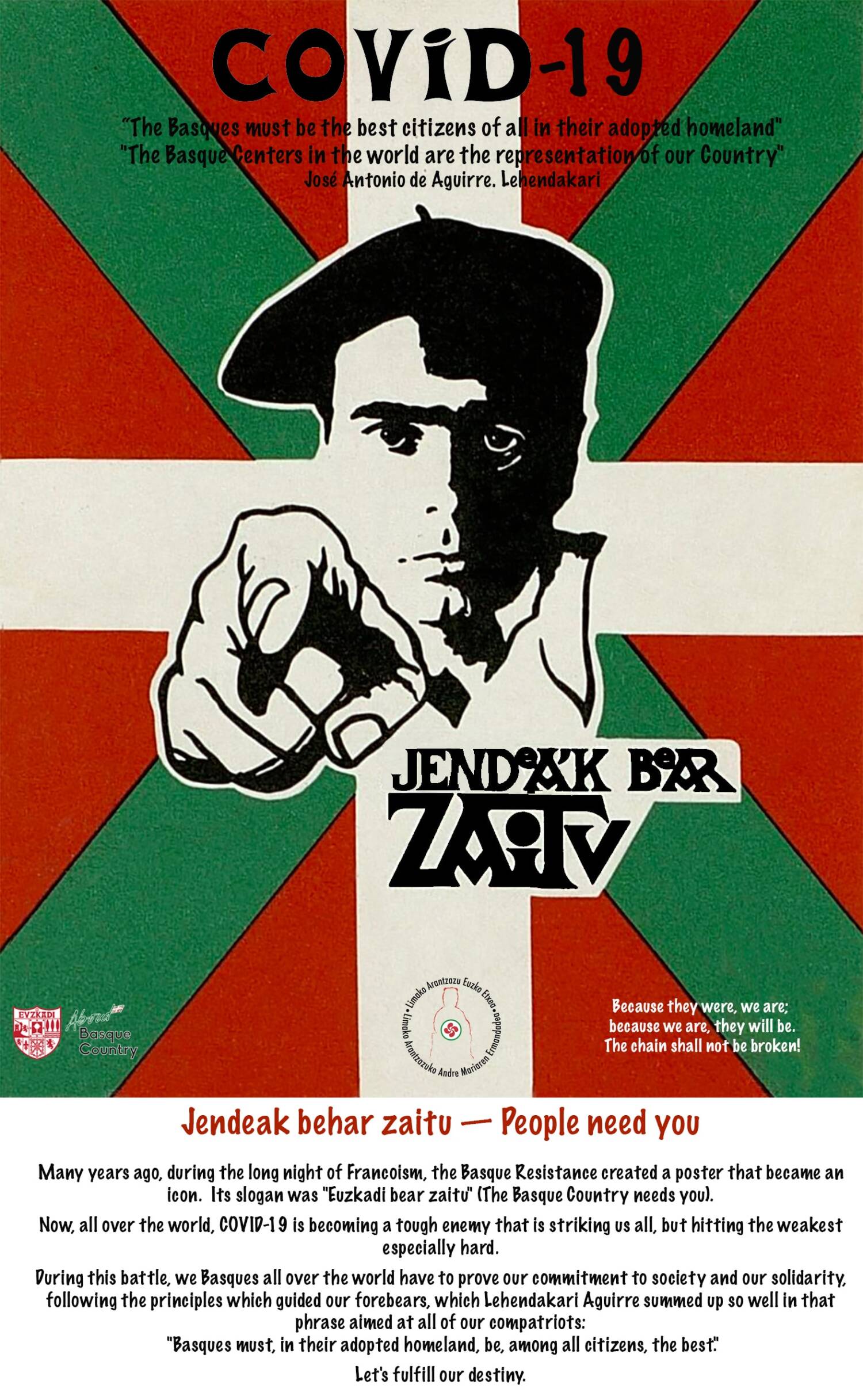 Many years ago, during the long night of Francoism, the Basque Resistance created a poster that became an icon. Its slogan was “Euzkadi bear zaitu” (The Basque Country needs you). Now, all over the world, COVID-19 is becoming a tough enemy that is striking us all, but hitting the weakest especially hard. During this battle, we Basques all over the world have to prove our commitment to society and our solidarity, following the principles which guided our forebears, which Lehendakari Aguirre summed up so well in that phrase aimed at all of our compatriots: “Basques must, in their adopted homeland, be, among all citizens, the best.” Let’s fulfill our destiny.