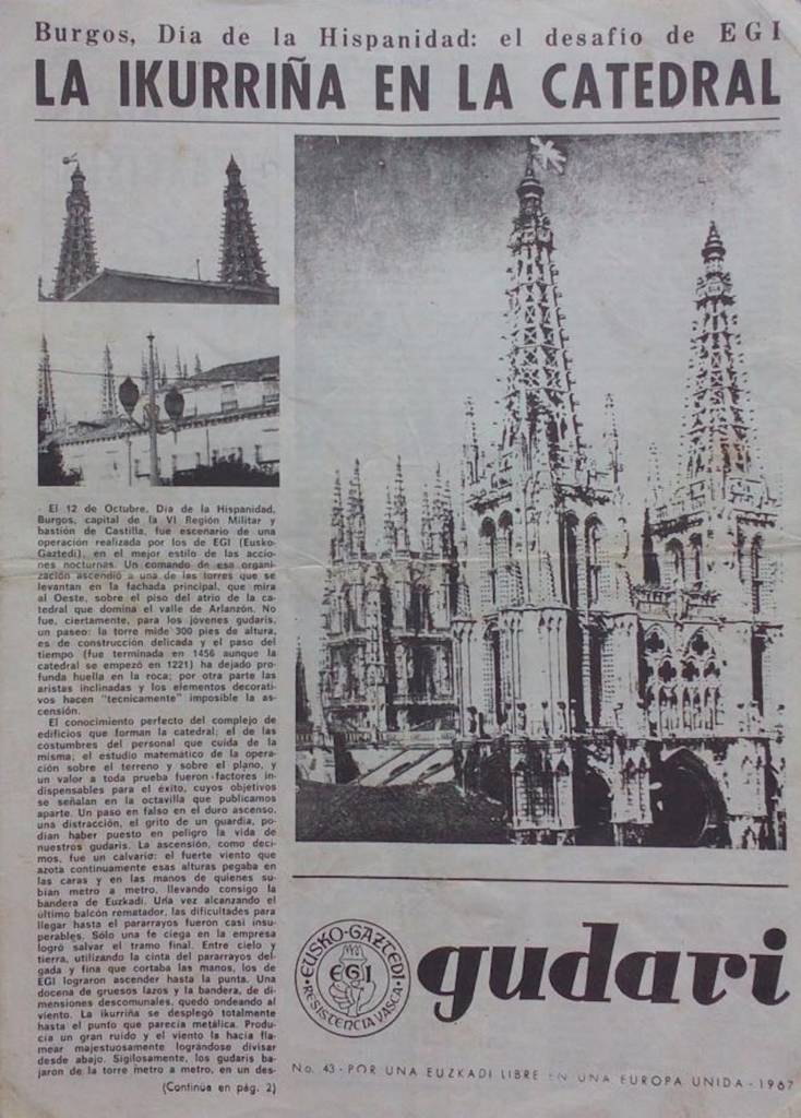Gudari nº 43.1967. Clandestine gazette of the EGI. Hoisting an ikurriña on Burgos Cathedral on October 12