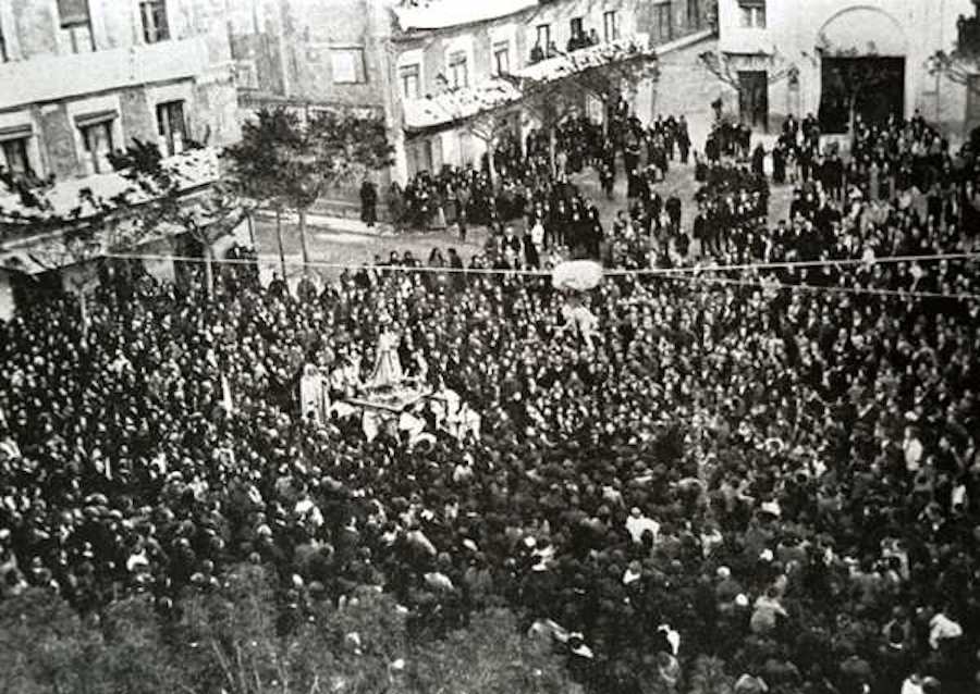 El algarabío era tal que unos aplaudían a las francesas, ellas saludaban y reían, otros gritaban Viva la Virgen María, los de las andas que no se movían, y los de la Brigadilla Municipal, al oír tantos aplausos dijeron, “tira que ya le ha quitao el velo”.