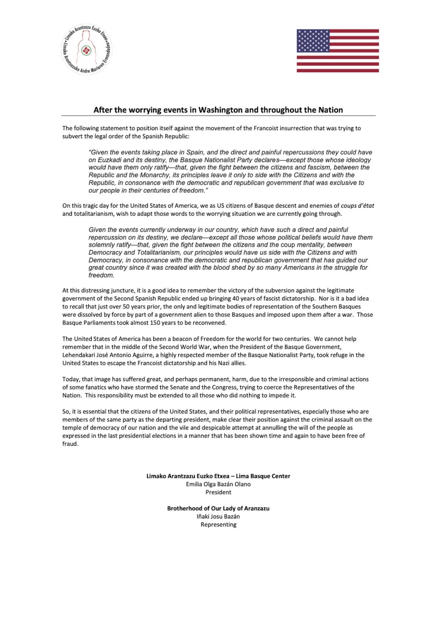 On this tragic day for the United States of America, we as US citizens of Basque descent and enemies of coups d’état and totalitarianism, wish to adapt those words to the worrying situation we are currently going through.