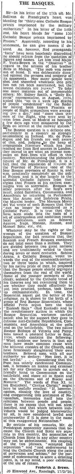 This letter was part of a letter debate Prendergast began, denouncing the jailing of Basque priests by Franco, and that sparked a debate between him and a group who enthusiastically defended the fascist rebels. By the way, we can’t help imagining that behind some of those signatures (or noms de plume) are some who worked at the embassy the Franco régime set up in the Republic of Ireland. One of those noms de plume even got a direct message from the newspaper, telling him or her that they would not publish without a name and address (we wish modern social networks were so dedicated). Interestingly, “Ebro” never got back to them.