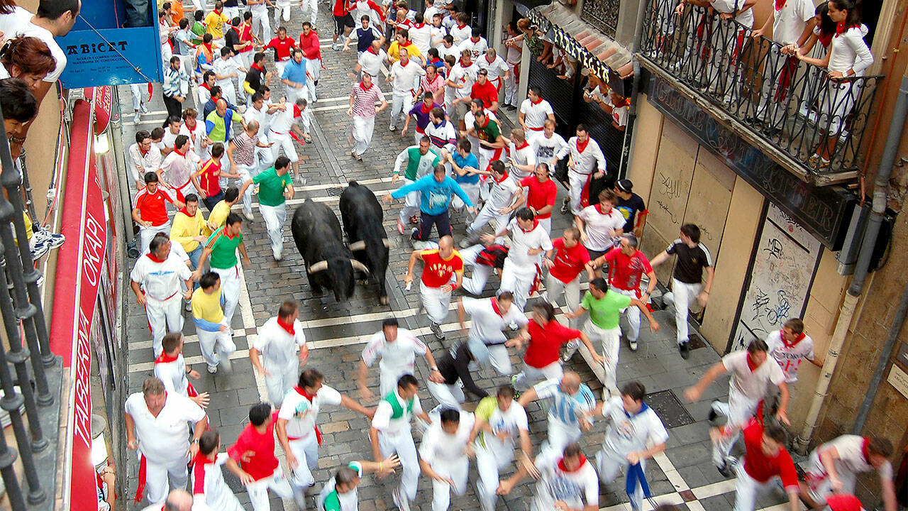 Like a cowboy at a rodeo, I sit atop my spot on the fence. A loudspeaker declares — first in Spanish, then in English — “Do not touch the wounded. That is the responsibility of health personnel.” A line of fluorescent-green-vested police sweeps down the street, clearing away drunks and anyone not fit to run. Then the cleaning crew and their street-scrubbing truck make one last pass, gathering garbage and clearing broken glass. The street — just an hour ago filled with throngs of all-night revelers — is now pristine, sanitized for a televised spectacle. It’s the annual Running of the Bulls in Pamplona, Spain.