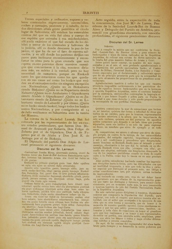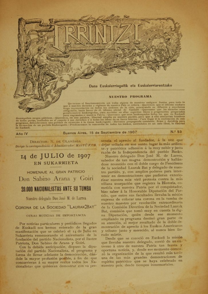 Hemen duzue kronika, 1907ko irailaren 15ean jasotzen baita Irrintzi argitalpenean, azpititulu hauekin “Dana Euskalerriagaitik eta Euskalerriarentzako”, “Jaun Goikua eta Lege Zarra o “¡Viva Euzkadi libre!”, argitaratu baitzen Maipu-n (Argentina) 1905 eta 1923 artean.
